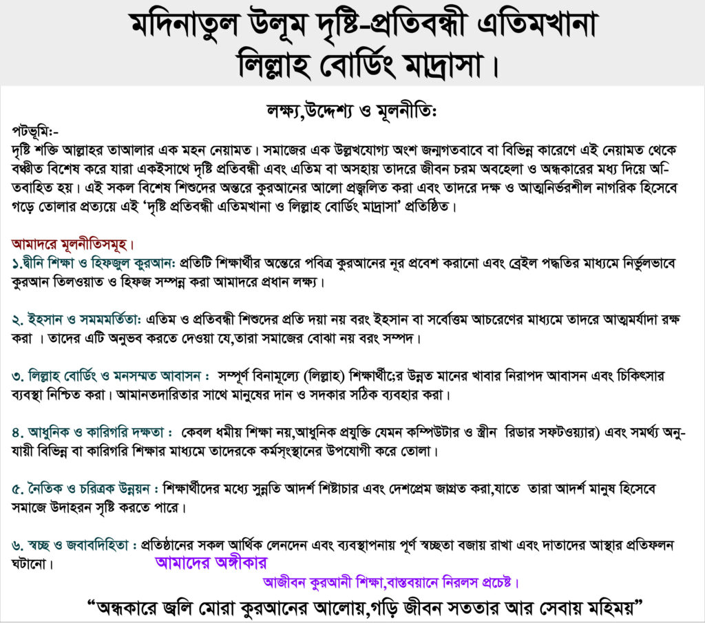 আবাসন ও খাদ্য: এতিম ও দুস্থ শিক্ষার্থীদের জন্য সম্পূর্ণ বিনামূল্যে থাকা এবং উন্নত মানের খাবারের ব্যবস্থা করা (লিল্লাহ বোর্ডিং)।